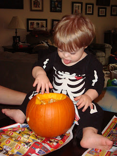 Adorable costume! He's braver than I am with pumpkin carving -- just don't like the slimy feeling anymore (yes, I used to carve pumpkins...) Anyway, super cutie patootie!
